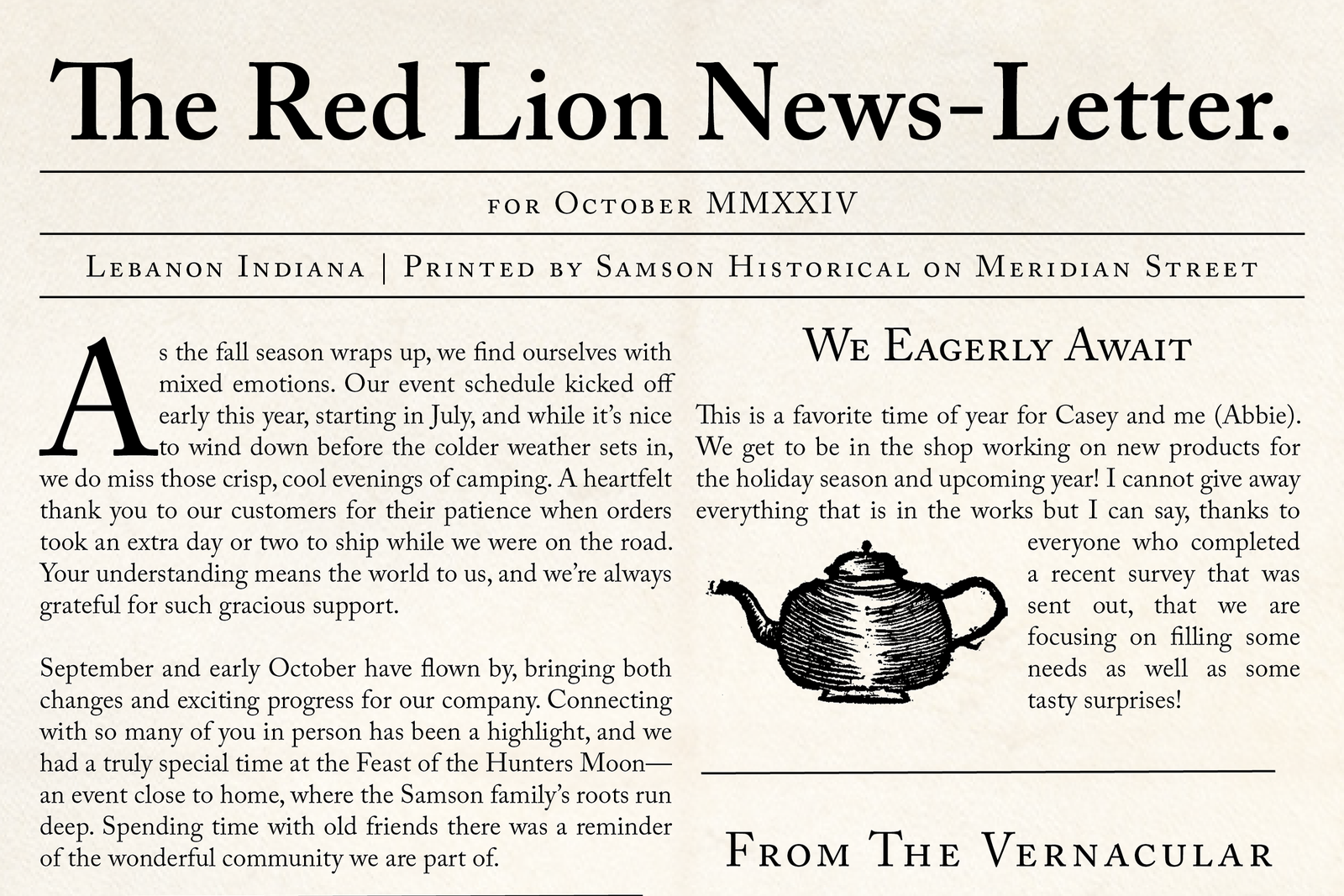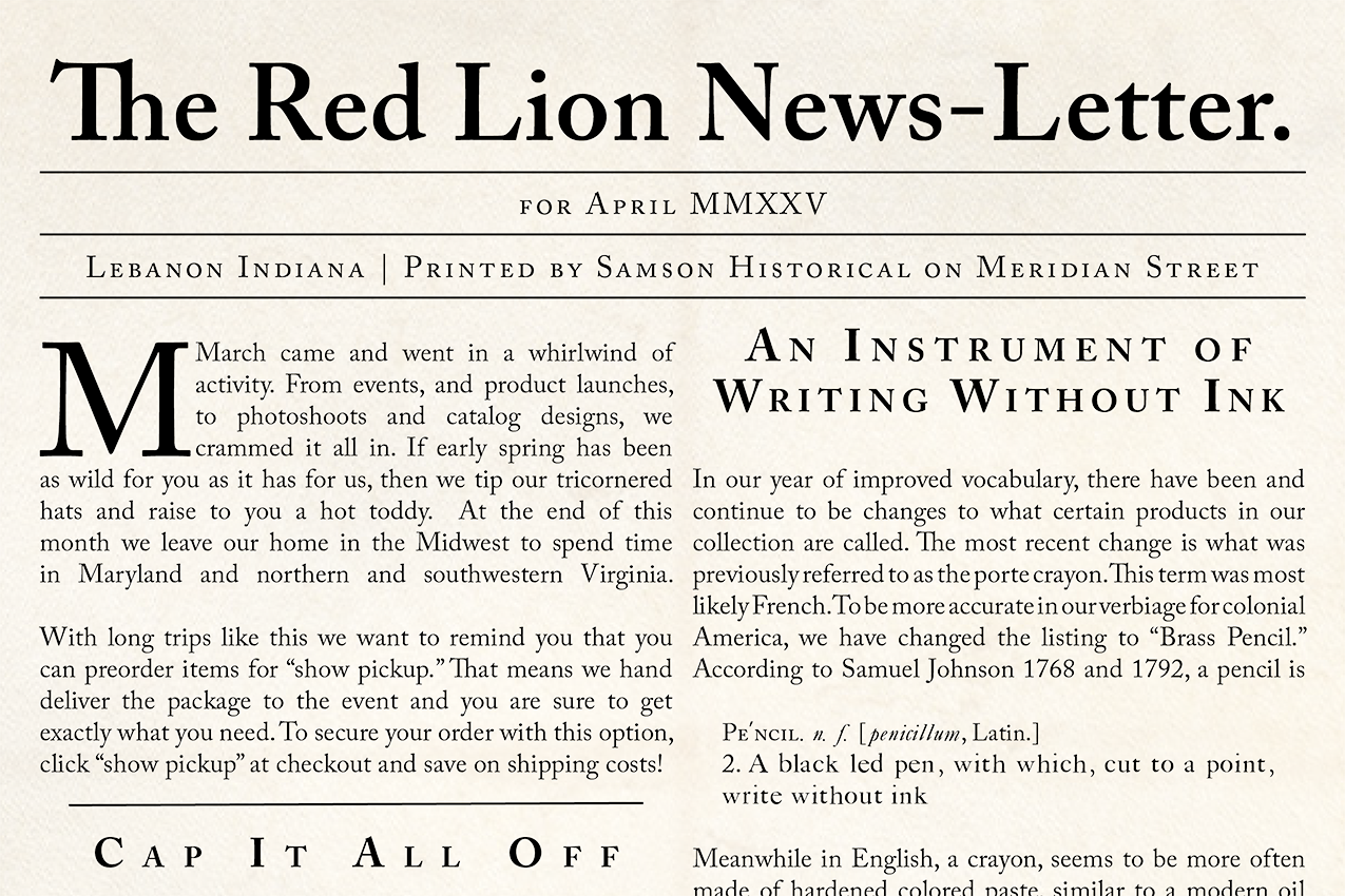 March came and went in a whirlwind of activity. From events, and product launches, to photoshoots and catalog designs, we crammed it all in. If early spring has been as wild for you as it has for us, then we tip our tricornered hats and raise to you a hot toddy. At the end of this month we leave our home in the Midwest to spend time in Maryland and northern and southwestern Virginia.