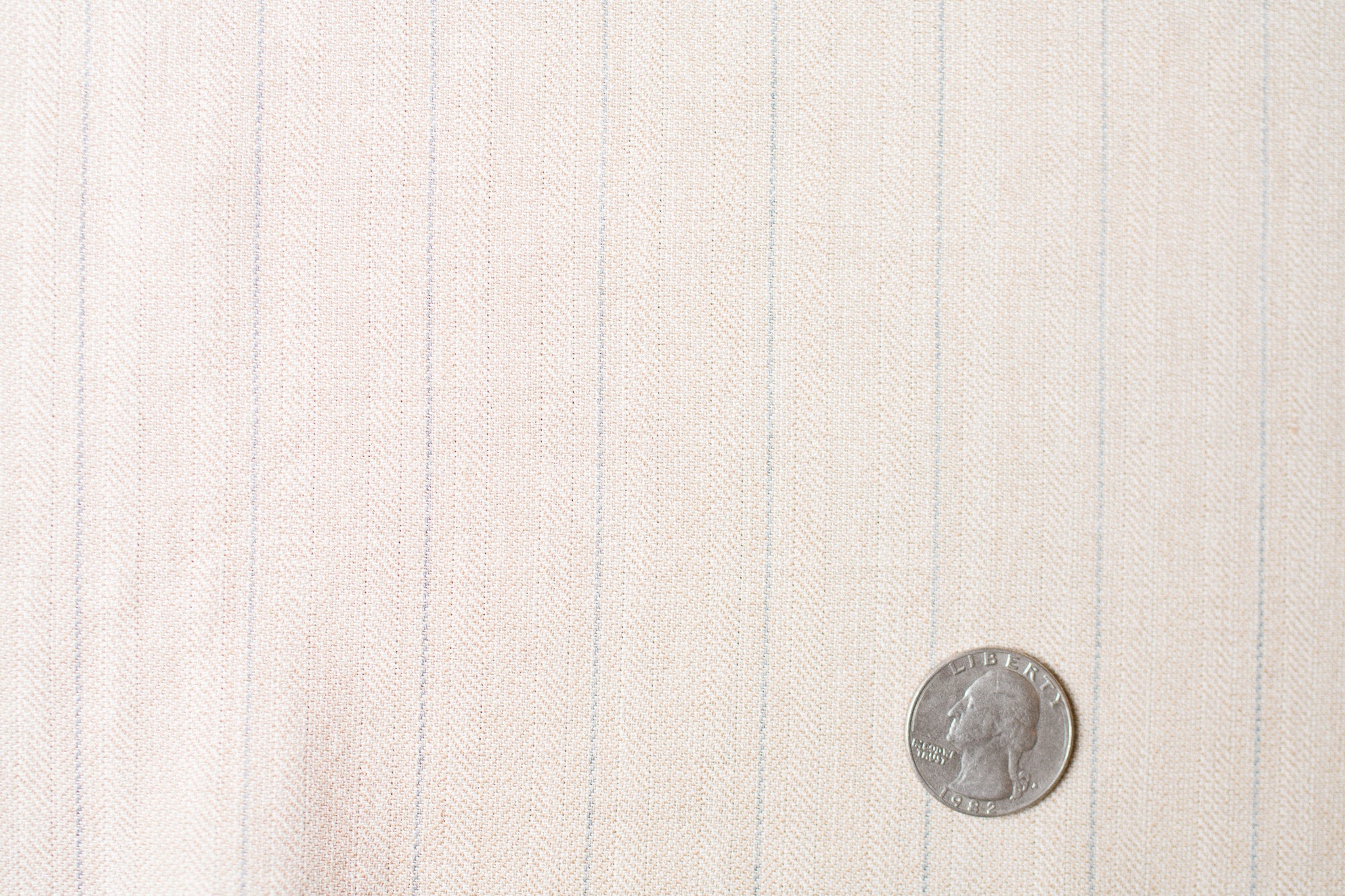 Its smooth hand and balanced structure make it suitable for garments and accessories that benefit from a fabric with both texture and subtle patterning. The combination of the wheat tone, fine herringbone, and delicate blue stripe creates a versatile, period-appropriate appearance that works well across many historical impressions.