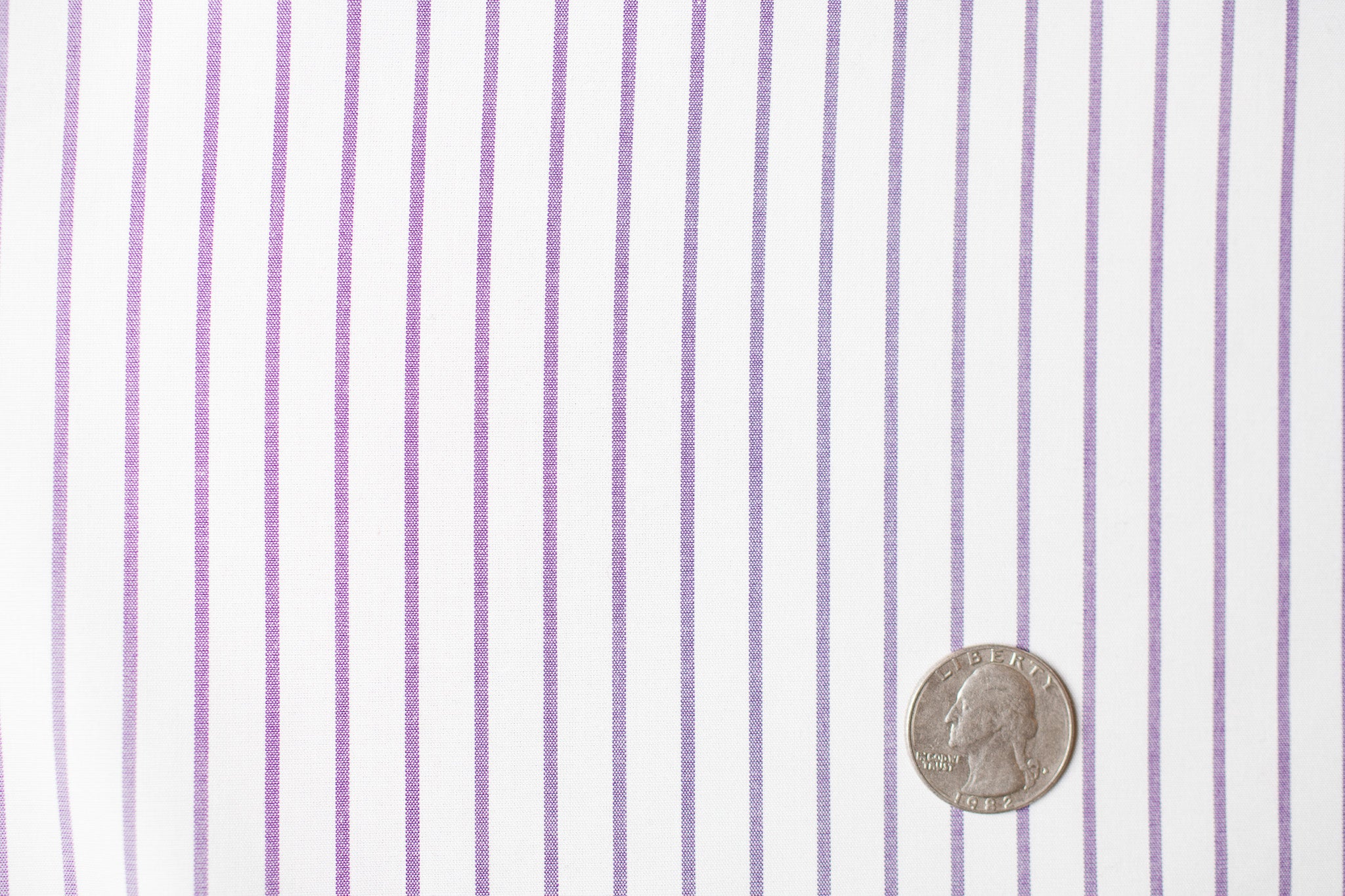 White with Lilac Stripe Cotton has a clean white ground accented by a slightly wider white stripe and a narrow lilac stripe woven neatly through the fabric. The combination creates a soft, orderly pattern that feels light and fresh without being overpowering.